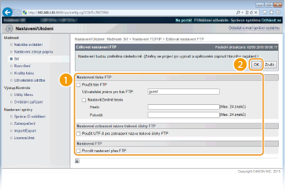 Tisk FTP a nastavení FTP můžete povolit nebo zakázat také z nabídky nastavení na ovládacím panelu. FTP