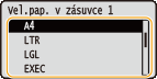 vyberte jednu z možností <Vel.pap. v zásuvce 1> na <Vel.pap. v zásuvce 4>, a stiskněte