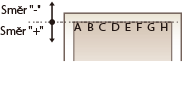 Když se kontrolní značky pozice tisku vytisknou mimo středovou pozici, musíte pozici tisku upravit. Když pozici tisku upravíte, zadejte směr pomocí „+“ a „-“ a vzdálenost pomocí „mm“. Pomocí „-“ posunete pozici tisku nahoru a pomocí „+“ ji posunete dolů (korekce svislé pozice). Pomocí „-“ posunete pozici tisku doleva a pomocí „+“ ji posunete doprava (korekce vodorovné pozice).