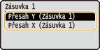 K úpravě polohy tisku u všech typů tisku bez ohledu na zdroj papíru můžete použít možnost <Přesah Y> a <Přesah X> v nabídce nastavení na ovládacím panelu. Polohu tisku můžete upravit v rozsahu -50,0 až +50,0 mm v krocích po 0,5 mm v obou směrech: ve svislém i vodorovném směru. Přesah Y/Přesah X