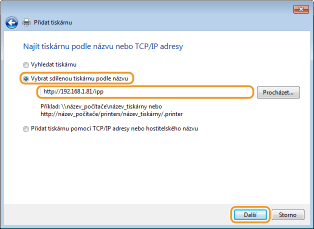 Vyberte možnost [Vybrat sdílenou tiskárnu podle názvu], zadejte místo připojení a klikněte na [Další].