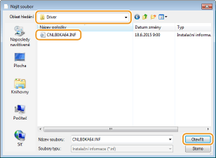 Zadejte složku, kde jsou ovladače tiskárny, vyberte soubor INF a pak klikněte na [Otevřít].
