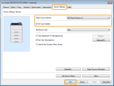 Můžete používat ovladač tiskárny Generic Plus PCL6 a také ovladač tiskárny UFR II. Dostupná nastavení tisku se liší podle ovladače tiskárny. Další informace získáte kliknutím na možnost [Help] na každé obrazovce ovladače tiskárny.