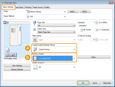 Vyberte možnost [1-sided Printing] (Jednostranný tisk) nebo [2-sided Printing] (Oboustranný tisk) v [1-sided/2-sided/Booklet Printing] (1stranný tisk / oboustranný tisk / tisk brožury)
