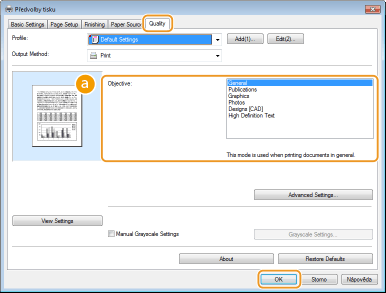Vyberte možnost odpovídající typu dokumentu a účelu tisku. V případě obecného použití vyberte možnost [General] (Obecné), případně chcete-li tisknout fotografické obrázky v optimální kvalitě, vyberte možnost [Photos] (Fotografie).