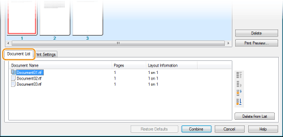 Kliknutím na kartu [Document List] (Seznam dokumentů) zobrazíte dokumenty přidané v krocích 1 až 4. Dokumenty lze odebrat tak, že je vyberete v seznamu a kliknete na možnost [Delete from List] (Odstranit ze seznamu).