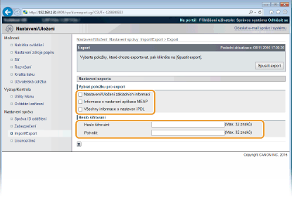 Pokud chcete exportovat data nastavení položek, které lze odeslat z možnosti [Nastavení/Uložení] na stránce portálu, zaškrtněte políčka příslušných položek.
