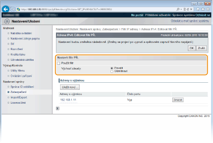 Pokud zadáte IP adresy nebo čísla portů nesprávně, nemusí být možné se k zařízení připojit prostřednictvím Vzdáleného uživatelského rozhraní. V takovém případě je třeba nastavit <Filtr adresy> na <Vyp>. Filtr adresy