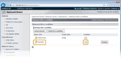 Pokud je pár klíčů z nějakého důvodu aktuálně používán, např. pokud se pod položkou [Použití klíče]zobrazuje informace „TLS“ nebo „IEEE 802.1X“, pak tento pár klíčů nelze smazat. V takovém případě je před smazáním nutné příslušnou funkci zakázat nebo vyměnit.