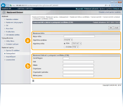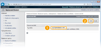 Pokud šifrovaná komunikace probíhající prostřednictvím protokolu Transport Layer Security (TLS) vyžaduje pár klíčů, je možné ho pomocí zařízení vygenerovat. Protokol TLS lze použít při přístupu k zařízení prostřednictvím Vzdáleného uživatelského rozhraní nebo při tisku IPP. Pro zařízení je možné registrovat až osm párů klíčů, včetně předinstalovaných párů. Certifikáty podepsané svým držitelem jsou používány s páry klíčů vygenerovanými pomocí možnosti „Komunikace v síti“. Pomocí možnosti „Klíč a žádost o podepsání certifikátu (CSR)“ můžete požádat o digitální certifikát od certifikační autority pro pár klíčů vygenerovaný zařízením.