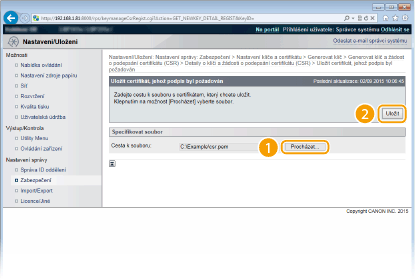 Klikněte na tlačítko[Procházet] v [Cesta k souboru], zadejte soubor, pro který chcete žádat o podepsání certifikátu (CSR), a klikněte na tlačítko [Uložit].