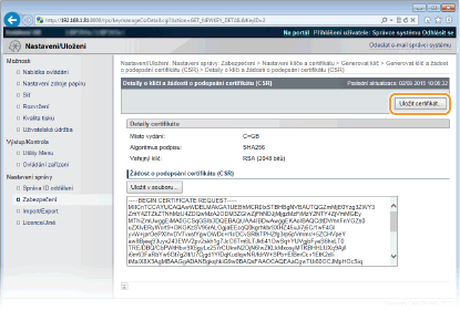 Pár klíčů vygenerovaný žádostí o podepsání certifikátu (CSR) nemůžete použít, dokud nebude certifikát uložen. Jakmile certifikační autorita vystaví digitální certifikát, uložte jej podle následujících pokynů.