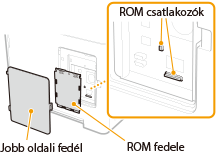 Ez a rész ismerteti a Barcode Printing Kit-F1 és a PCL International Font Set-C1 telepítésének módját. A ROM használatához csatlakoztassa azt a készülék jobb oldali fedelének belső részén található ROM csatlakozókhoz. A ROM telepítését megelőzően olvassa el a Telepítés részben leírt óvintézkedéseket.