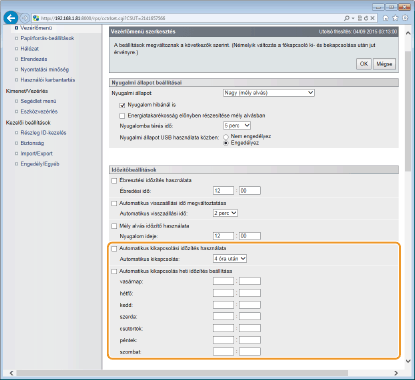 Megadhatja, hogy a készülék automatikusan kikapcsoljon, ha hosszú ideig nem végeznek rajta műveletet. Beállíthatja azt is, hogy a készülék egy megadott időpontban kapcsoljon ki. Ezekkel a funkciókkal elkerülheti a felesleges energiafogyasztást abban az esetben, ha elfelejtené kikapcsolni a készüléket. Ezek a funkciók alapértelmezés szerint be vannak kapcsolva.
