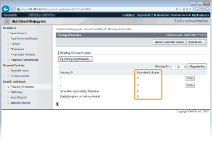 Az ellenőrzés eredményének nyomtatásaOldalszámlálás visszaállítása nulláraHa az egyes részlegek oldalszámlálását vissza kívánja állítani nullára, akkor kattintson a [Részleg ID] alatt található szöveges hivatkozásra, majd kattintson a [Számláló törlése]