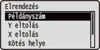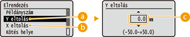 Az egyes papírforrásokhoz finomra hangolhatja a nyomtatási pozíciót a <Használói karbant.> pont <Nyomt.helyzet beáll.> elemében. Az eltolási értékek elérhető tartománya a következő: -5,0–+5,0 mm. A nyomtatási pozíció beállítása
