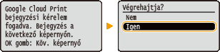 A készüléket egy mobileszközről vagy a Google Chrome-ból is regisztrálhatja. A regisztráció befejezése előtt a készülék kijelzőjén a következő megerősítő képernyő jelenik meg. A regisztráció befejezéséhez hajtsa végre a következőt:  <Igen>  .