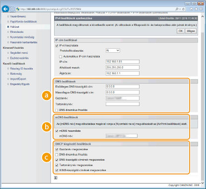 Jelölje be a jelölőnégyzetet, ha az IPv4 hálózathoz beállított mDNS nevet szeretné használni. Különböző név beállításához törölje a jelet a jelölőnégyzetből, majd legfeljebb 63 karakter használatával adja meg az mDNS nevet az [mDNS-név] szövegmezőben. [DHCP kiegészítő beállítások][DNS-kiszolgáló címének megszerzése]