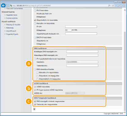 Ha bejelöli a jelölőnégyzetet, akkor a készülék dinamikusan frissíti a DNS-rekordokat, amikor megváltozik az IP-címe. A [Manuális cím regisztrálása], [Állapottartó cím bejegyzése] és [Állapotnélküli cím bejegyzése] jelölőnégyzetek közül a megfelelők bejelölésével adja meg a DNS-kiszolgálón bejegyezni kívánt címtípusokat. [mDNS-beállítások][mDNS használata]
