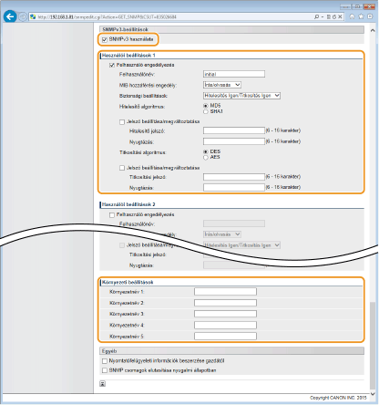 A jelölőnégyzet bejelölése esetén előfordulhat, hogy az SNMP protokollt használó alkalmazások (például a Canon imageWARE szoftversorozata) készülékhez való hozzáférését letiltja a rendszer.
