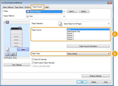 A készülék automatikusan választja ki a nyomtatáshoz használandó papírforrást a megadott méret és típus, valamint a készüléken megadott beállítások alapján.