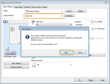Válassza a [Store] (Tárolása) elemet a [Output Method] (Kimeneti mód) menüpontban, majd kattintson az [Igen] gombra.