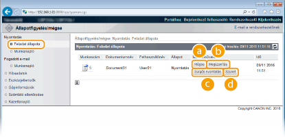 A gyári alapbeállítások megakadályozzák bizonyos műveleteknek – például a nyomtatandó dokumentumok törlésének vagy a nyomtatási feladat megszakításának – általános felhasználói módban történő elvégzését. Amennyiben általános felhasználói módban kíván dokumentumokat kezelni, jelentkezzen be rendszerkezelői módban, és engedélyezze az [Általános felhasználó műveletének engedélyezése] funkciót. Végfelhasználók dokumentumkezelésének engedélyezése