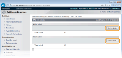 Ha helytelenül adja meg az IP-címeket, akkor előfordulhat, hogy nem fog tudni hozzáférni a készülékhez a Távoli felhasználói felületről, amely esetben a <Címszűrés> a <Ki> értékre kell állítani. Címszűrés