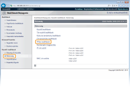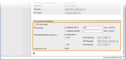 Az IPSec kommunikációs beállításainak konfigurálása előttEllenőrizze annak az operációs rendszernek az IPSec beállításait, amellyel a készülék kommunikációt fog folytatni. Ha az operációs rendszer és a készülék beállításai nem kompatibilisek egymással, az letiltja az IPSec kommunikációt.