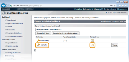 Ha egy kulcspárt használja valamilyen funkció, például a [Kulcs használata] mezőben a TLS vagy az IEEE 802.1X lehetőség van kiválasztva, akkor nem törölhető. Ebben az esetben a kulcspár törlése előtt ki kell kapcsolni a funkciót, vagy le kell cserélnie a kulcspárt.