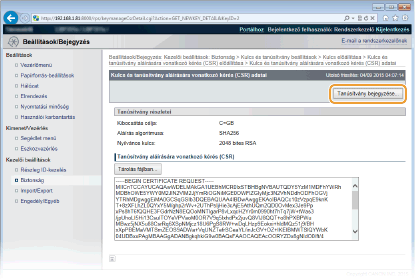 A tanúsítvány aláírási kérelmével (CSR) létrehozott kulcspár nem használható, amíg végre nem hajtja a bejegyzését. Miután a hitelesítésszolgáltató kiadta a digitális tanúsítványt, jegyezze be azt az alábbi művelet végrehajtásával.