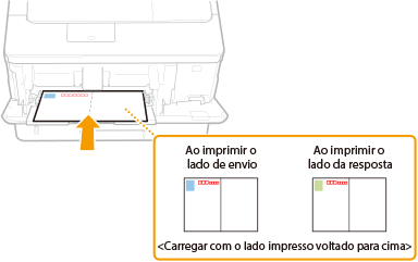 Insira o cartão postal com o lado de impressão voltado para cima e com a borda curta voltada para a máquina se o tipo de cartão for comum ou 4 em 1, ou na borda longa em direção à máquina se for cartão postal do tipo resposta.