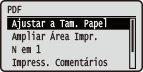 Todas as configurações sobre arquivos PDF disponíveis para Impressão Direta USB e Impressão Direta são listados com descrições curtas. As predefinições estão marcadas com uma cruz (