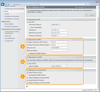 Adotado pelo Bonjour, o mDNS (DNS multicast) é um protocolo para associar um nome de host com um endereço IP sem usar o DNS. Marque a caixa de seleção para ativar o mDNS e digite o nome mDNS na caixa de texto [Nome de mDNS] usando até 63 caracteres. Esta caixa de texto só pode ser selecionada quando a caixa de seleção [Usar IPv4] estiver marcada. [Configurações de Opção DHCP][Adquirir Nome de Host]