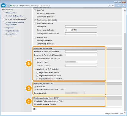 Marque a caixa de seleção para usar o mesmo nome do mDNS do IPv4. Para definir um nome diferente, desmarque a caixa de seleção e digite o nome do mDNS na caixa de texto [Nome de mDNS] usando até 63 caracteres. [Configurações de Opção DHCP][Adquirir Endereço do Servidor DNS]