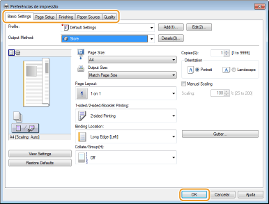 Clique na guia [Configurações básicas], [Configuração de página], [Acabamento], [Fonte de papel] ou [Qualidade] para especificar as configurações de impressão em cada tela, conforme necessário.