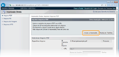 Selecione [URL] e digite a URL do arquivo PDF. Se a autenticação de usuário for executada, insira o nome de usuário e senha.