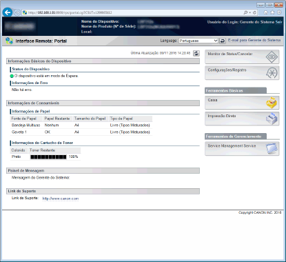 Para operar remotamente, você precisa inserir o endereço IP da máquina em um navegador da web e iniciar a Interface Remota. Verifique o endereço IP definido na máquina previamente (Impr. Status Rede). Se você possui alguma dúvida, consulte seu Administrador de rede.