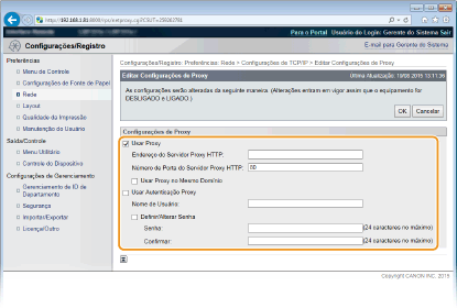 Para definir ou alterar a senha da autenticação por proxy, quando ela estiver ativa, marque a caixa de seleção e digite uma nova senha de até 24 caracteres alfanuméricos na caixa de texto [Senha]. Para confirmar, digite a mesma senha na caixa de texto [Confirmar].