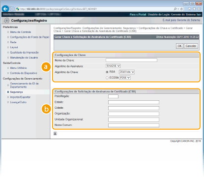 Um par de chaves pode ser gerado com a máquina quando for necessário para comunicações codificadas via Transport Layer Security (TLS). Você pode usar o TLS ao acessar a máquina via Interface Remota ou executar a Impressão IPP. É possível gerar até oito pares de chaves para a máquina, incluindo os pares instalados. Certificados autoassinados são usados com pares de chaves registrados na "Comunicação de Rede". Com uma "Chave e Solicitação de Assinatura de Certificado (CSR)", é possível aplicar um certificado digital emitido por uma CA para o par de chaves gerado pela máquina.