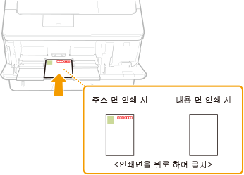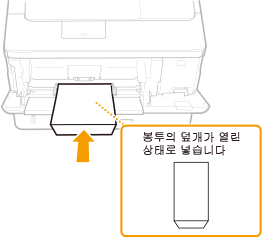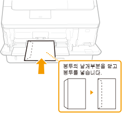 봉투를 세로 방향으로(짧은 가장자리가 기기를 향하도록), 비접착 면(앞면)이 아래로 향하도록 넣습니다. 봉투의 뒷면에는 인쇄할 수 없습니다.