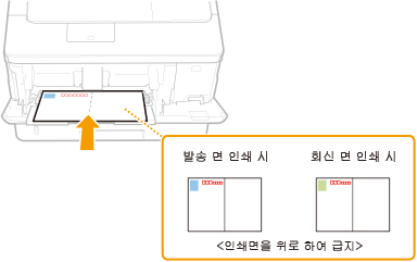 엽서를 인쇄면이 위로 향하도록 넣고, 엽서 종류가 일반 또는 1면에 4쪽 인쇄인 경우 짧은 가장자리가 기기를 향하도록 넣으며, 엽서 종류가 회신인 경우에는 긴 가장자리가 기기를 향하도록 삽입합니다.