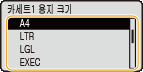 을 사용하여 <카세트1 용지 크기> 중 하나를 <카세트4 용지 크기>로 선택하고