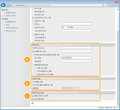기기의 IP 주소가 변경될 때마다 DNS 레코드를 동적으로 업데이트하려면 확인란을 선택합니다. DNS 서버에 등록할 주소 유형을 지정하려면 [수동 주소 등록], [스테이트풀 주소 등록], 또는 [스테이트리스 주소 등록]의 확인란을 선택합니다. [mDNS 설정][mDNS 사용]