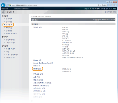 SNMP(Simple Network Management Protocol)는 MIB(Management Information Base)를 사용하여 네트워크의 통신 장치를 모니터링하고 제어하기 위한 프로토콜입니다. 본 기기는 SNMPv1 및 보안 기능이 개선된 SNMPv3을 지원합니다. 문서를 인쇄하거나 리모트 UI를 사용할 때 컴퓨터에서 기기의 상태를 확인할 수 있습니다. SNMPv1 또는 SNMPv3를 각각 또는 동시에 모두 활성화할 수 있습니다. 네트워크 환경과 사용 목적에 맞게 각 버전의 설정을 지정합니다.