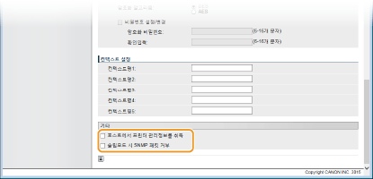 확인란을 선택하면, Canon 소프트웨어 imageWARE Series와 같이, SNMP 프로토콜을 사용하는 응용 프로그램의 기기 접근이 비활성화 될 수 있습니다.
