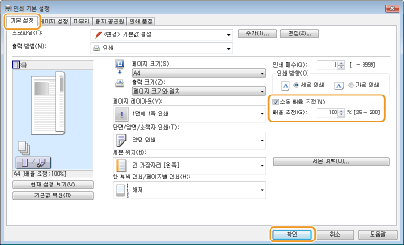 일부 응용 프로그램에서 확대/축소 설정은 프린터 드라이버보다 높은 우선 순위가 부여됩니다.