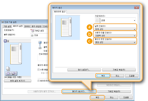 인쇄 날짜, 사용자 이름 또는 페이지 번호의 인쇄 위치를 선택합니다.