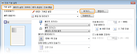 필요한 경우 [기본 설정], [페이지 설정], [마무리], [용지 공급원] 또는 [인쇄 품질] 탭을 클릭하고 각 화면에서 인쇄 설정을 지정합니다.