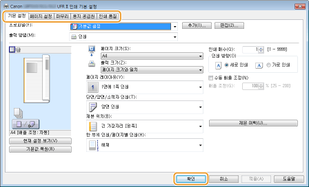 필요한 경우 [기본 설정], [페이지 설정], [마무리], [용지 공급원] 또는 [인쇄 품질] 탭을 클릭하고 각 화면에서 인쇄 설정을 지정합니다.